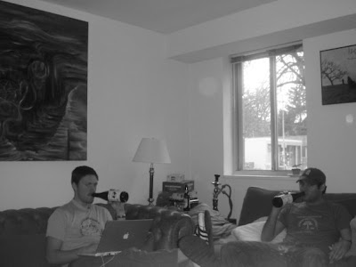 After breakfast we walked next door, purchased 4 bottles of cheap champagne, a 4-pack of sparks, and 4 40s. Later we picked up 2 gallons of orange juice. Then began an epic day of gaming, mimosas, and egg breaking. We started with a polite game of Jumbling Towers, moved on to a short-lived game of Bridge, progressed to an epic game of Apples to Apples To Go (100% New Card Content!), and finished the night off with a rousing game of Balderdash. Later in the night we played 4-Square egg toss in the street and read about how to squeeze an egg without breaking it.